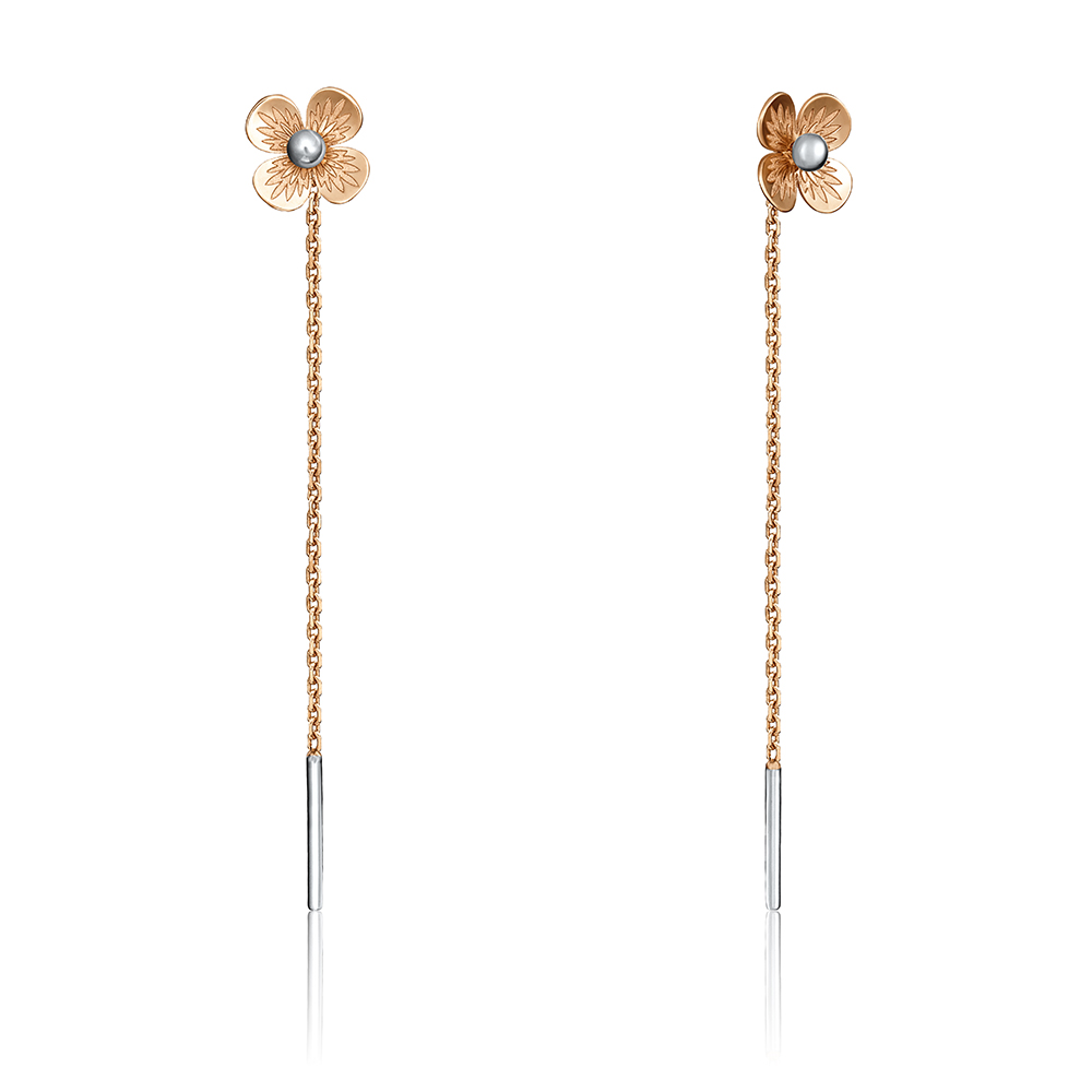 Durchziehohrringe aus 585er Rot- und Weißgold mit Blumenmotiv.