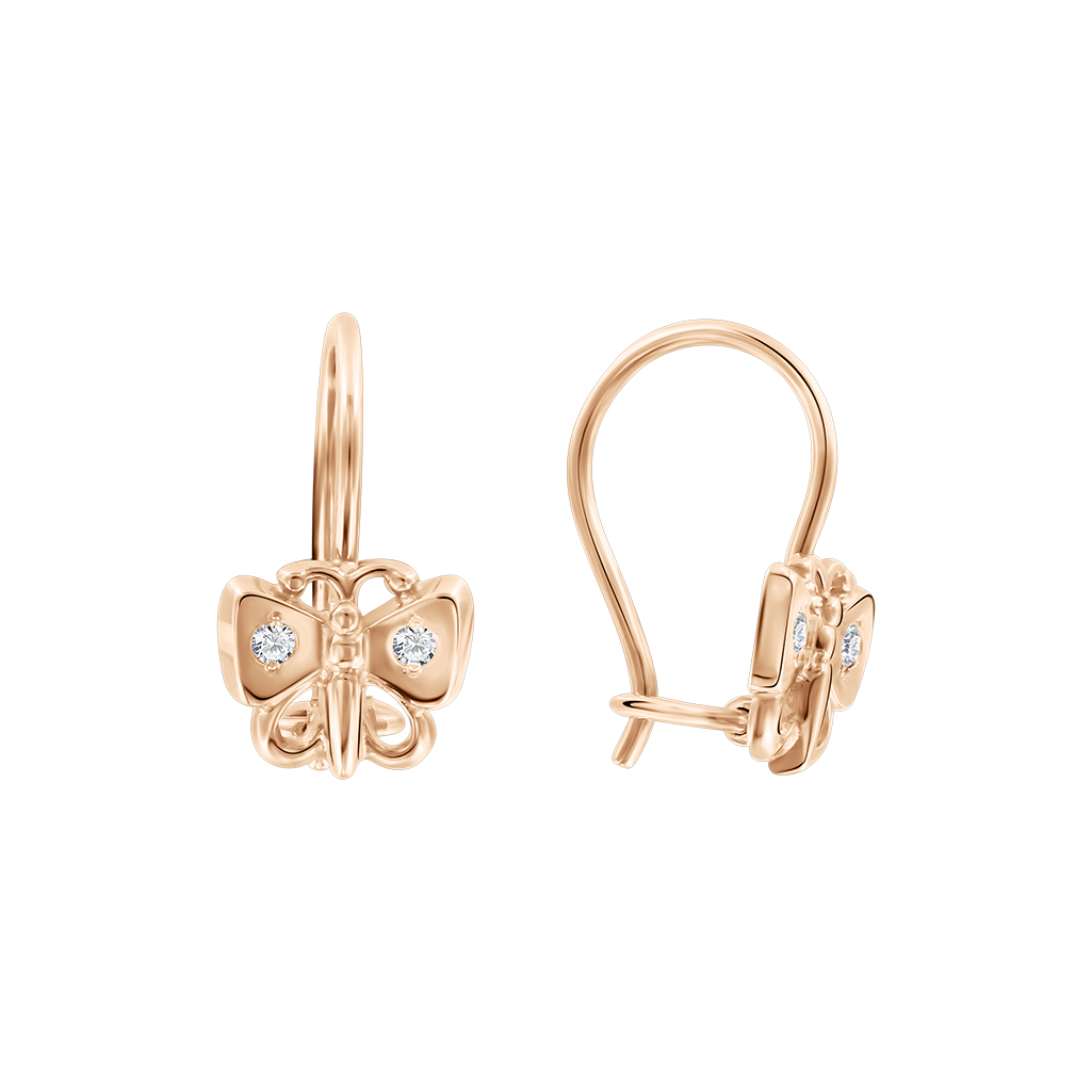 Pretty earrings butterflies, red gold 585, zirconia, height about 15 mm