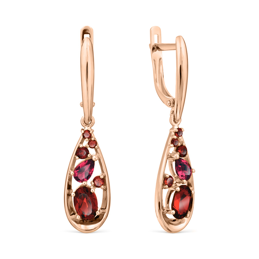 These graceful earrings in 14k Russian red gold (585) feature a drop-shaped design set with rich garnet and rhodolite stones in various cuts.