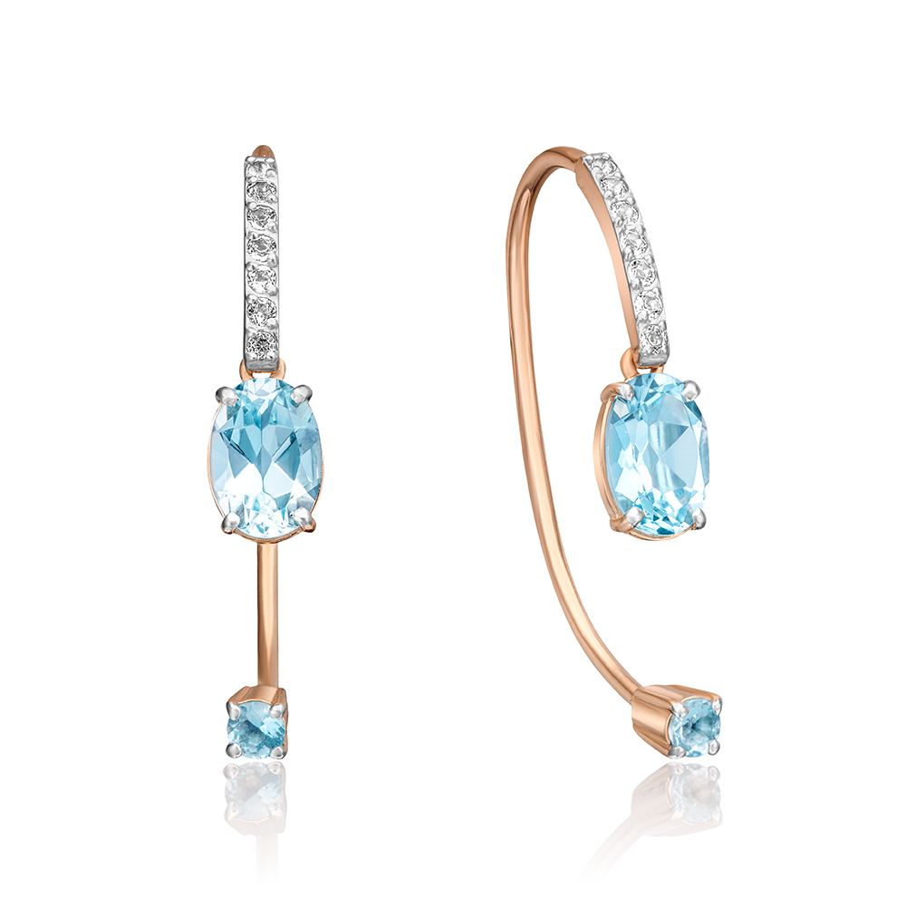 These elegant 14K red gold earrings feature a sophisticated contemporary design accented with natural blue topaz stones.