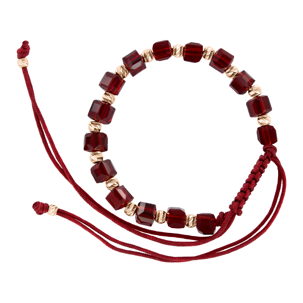 Bracelet “Burgundy thread” with Russian red gold 585, burgundy cord, with burgundy synthetic glass - sizes approx. 4*4 mm, diameter of a gold bead approx. 3 mm, adjustable length approx. 16-24 cm