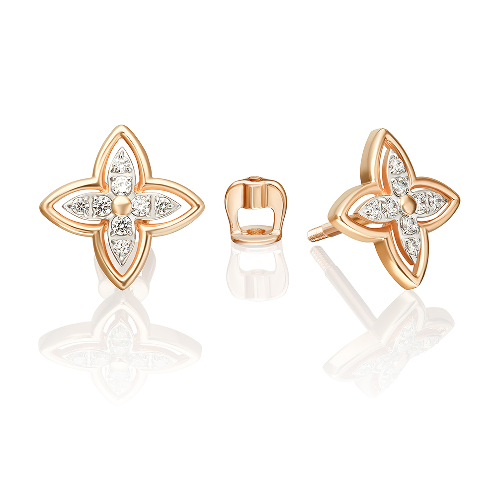 Stud Earrings in 14K Red Gold with Cubic Zirconia – Floral Design.