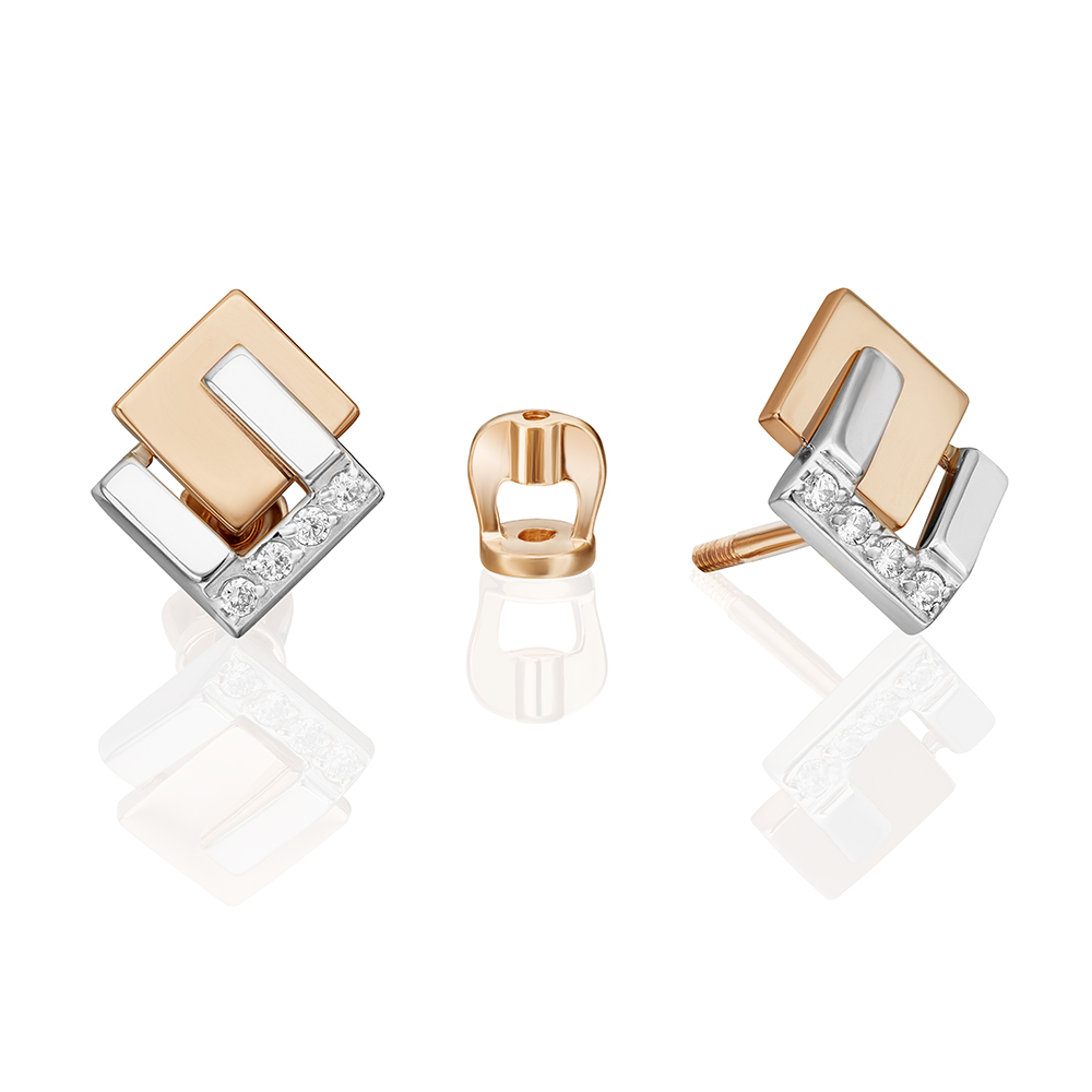 Bold and modern, these 14K red and white gold stud earrings stand out with their geometric silhouette and contrasting tones. A row of sparkling cubic zirconia stones adds a touch of brilliance to the clean, structured design.