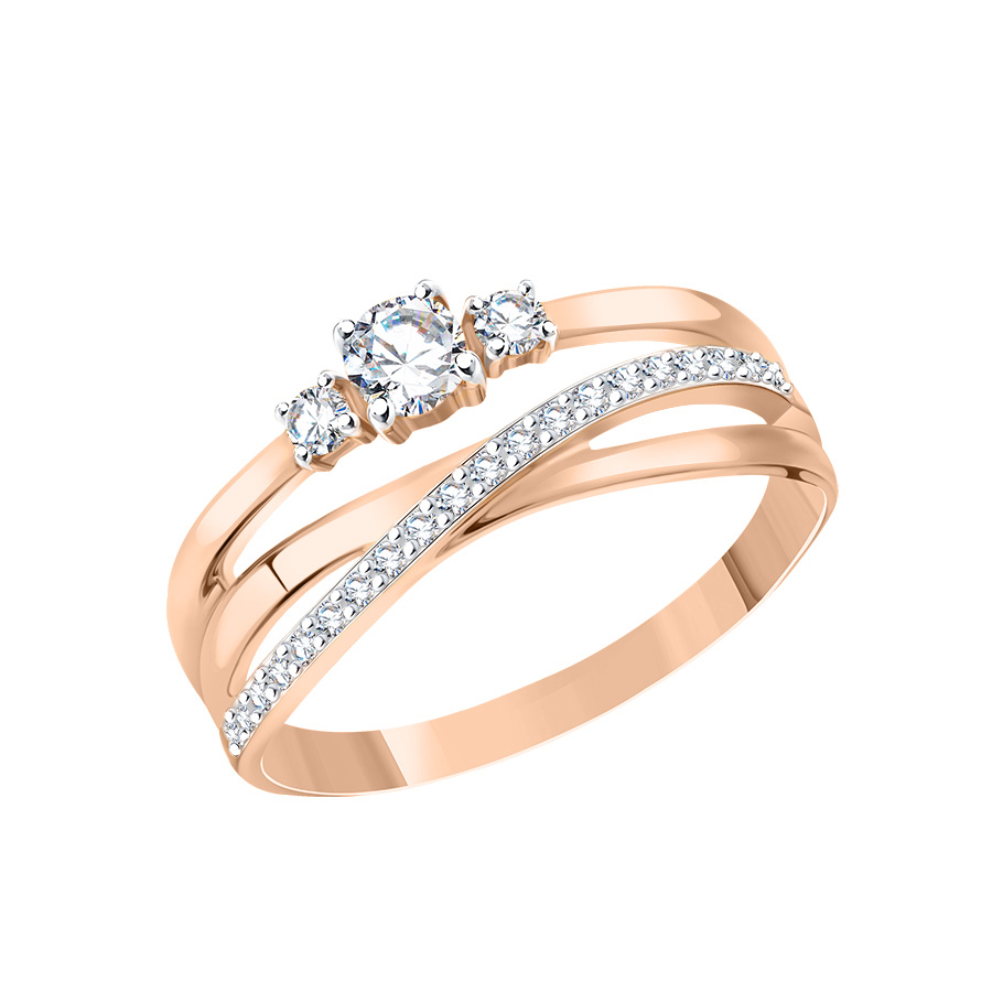 This women’s ring made of Russian 585 red gold with cubic zirconia is the embodiment of delicate elegance and modern design. Its exquisite diagonal line, adorned with sparkling cubic zirconia, and the central stones create an amazing inlay that captivates with its brilliance and perfection. This piece of jewelry will be a harmonious addition to both everyday and evening looks, highlighting the uniqueness and refined taste of its wearer.