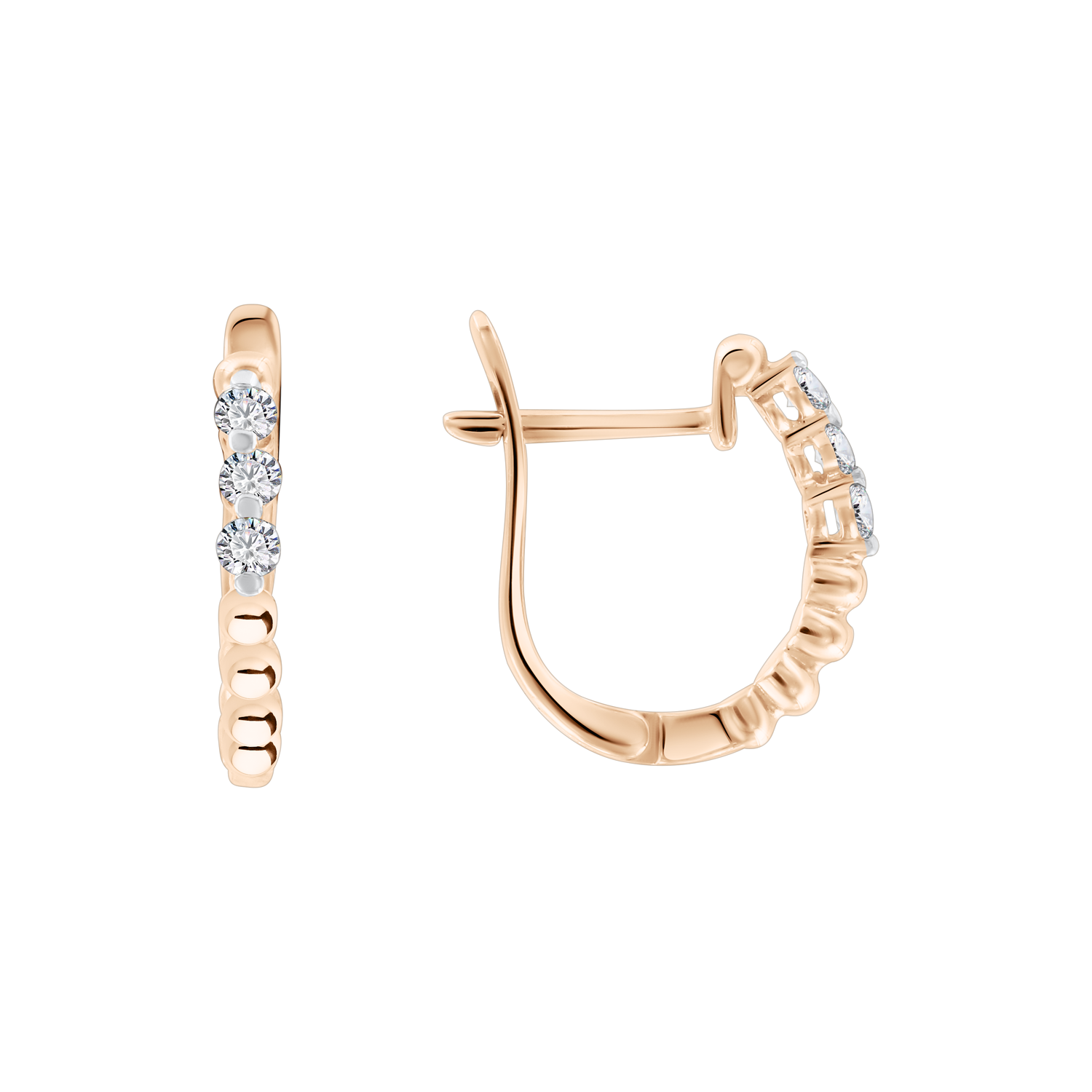 Sophisticated hoop earrings made of 14K (585) red gold, adorned with genuine diamonds set in smooth bezel settings. The alternating sizes of the stones add a dynamic yet elegant rhythm to the design, reflecting light beautifully. A perfect piece for those who appreciate timeless elegance with a modern touch — suitable for both daily wear and special occasions.