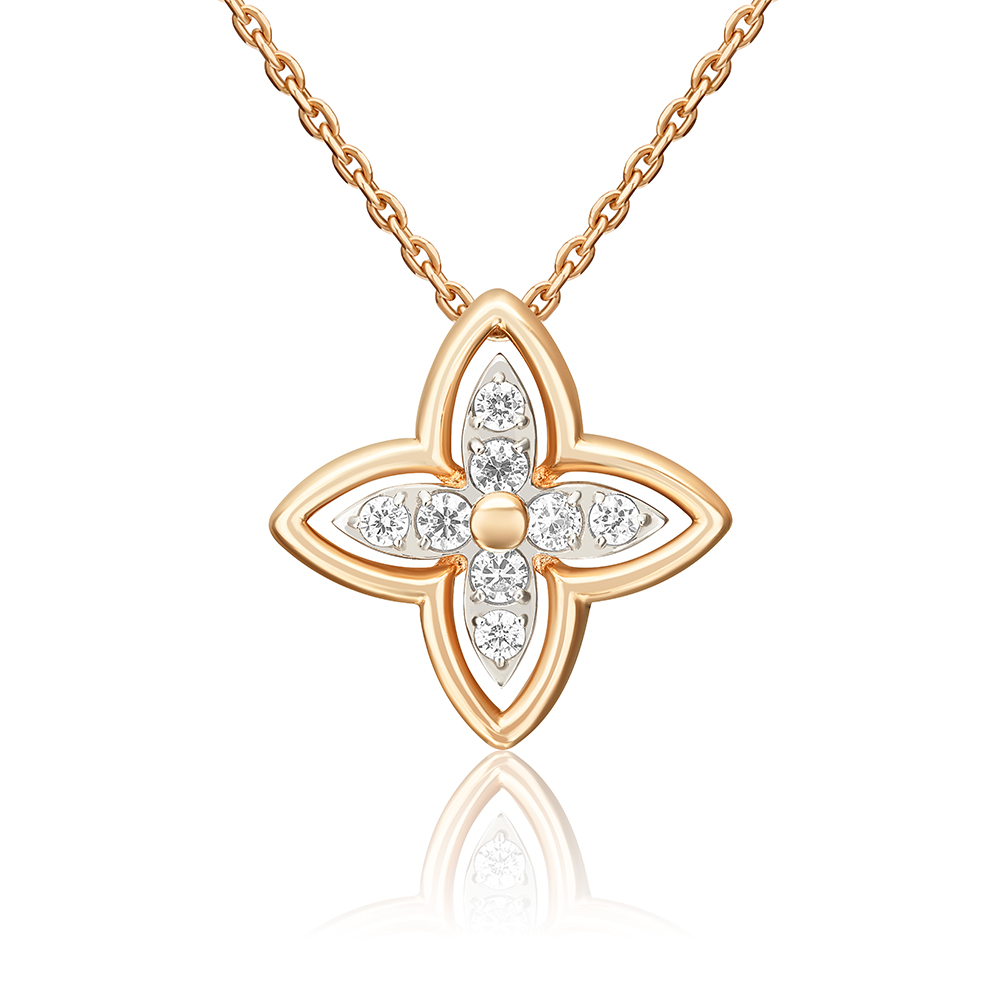 This elegant pendant in a floral design is crafted from 14K (585) red gold and adorned with sparkling zirconia. Its delicate shape and radiant finish bring a touch of grace, femininity, and inner harmony to any look.