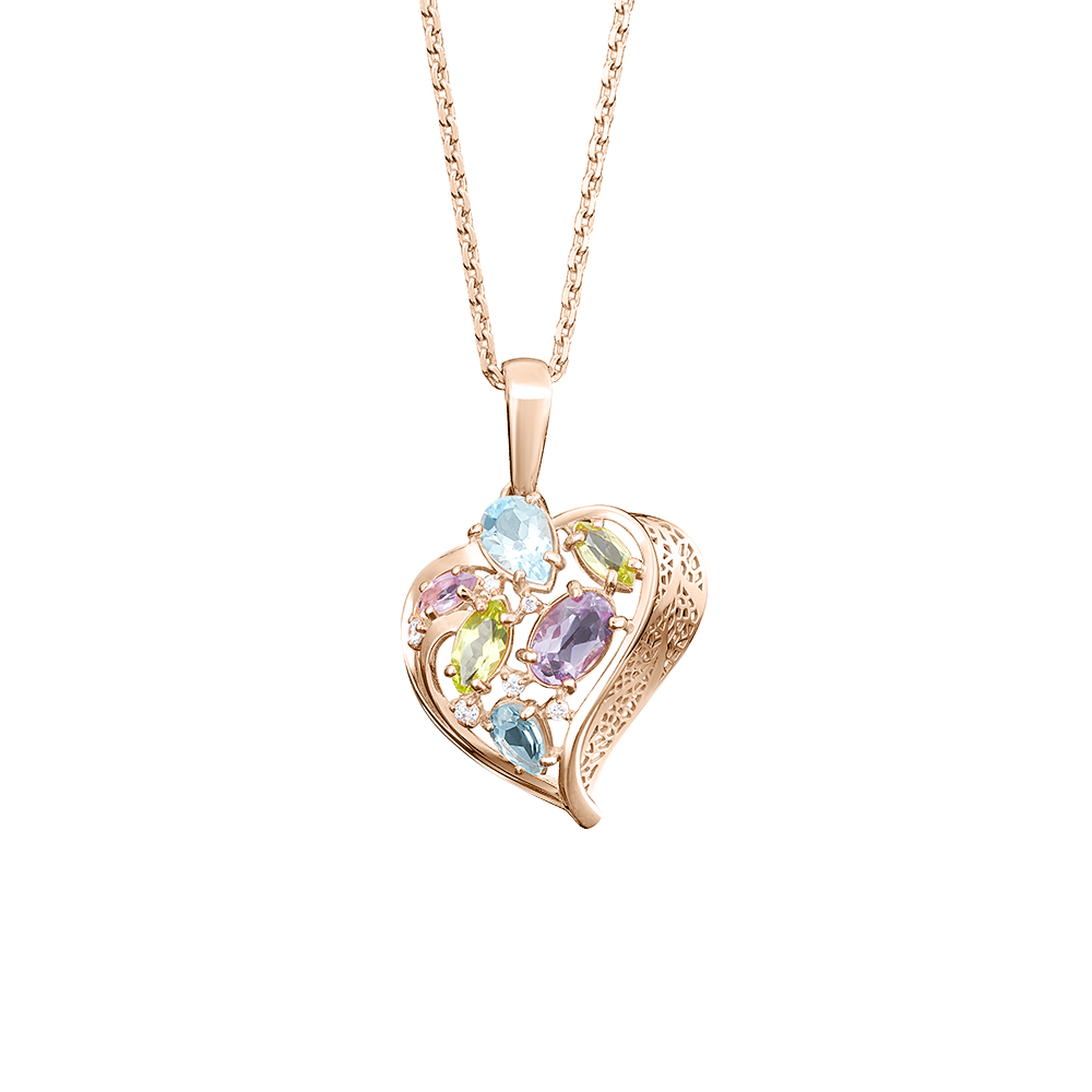 This charming heart-shaped pendant in 14K rose gold is a celebration of color, light, and emotion. Adorned with topaz, amethyst, peridot (chrysolite), and shimmering cubic zirconia, it brings together beauty and meaning in a single radiant piece.