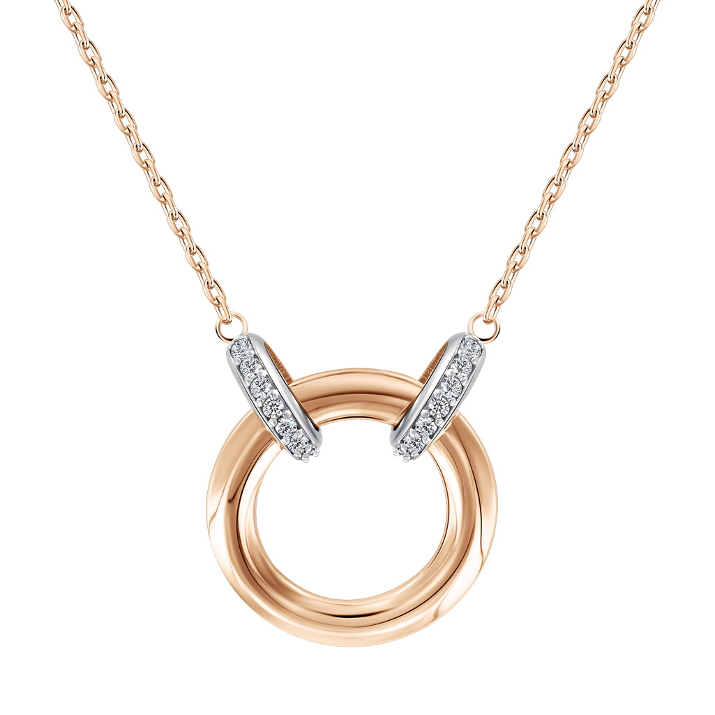 Stylish necklace with pendant crafted from 585 Russian red gold – a piece that perfectly combines elegance with modern aesthetics. The chain length is adjustable (approx. 44–49 cm) for a comfortable fit. The pendant, shaped as a circle (approx. 15 mm in diameter), features a refined design that blends the warm glow of red gold with the sparkling brilliance of cubic zirconia. The top part of the pendant is accented with white gold elements set with zirconia, adding a touch of sophistication and contemporary flair. Its clean yet striking design makes this necklace a versatile accessory, ideal for both daily wear and special occasions. A wonderful gift for women who appreciate minimalism and timeless elegance.