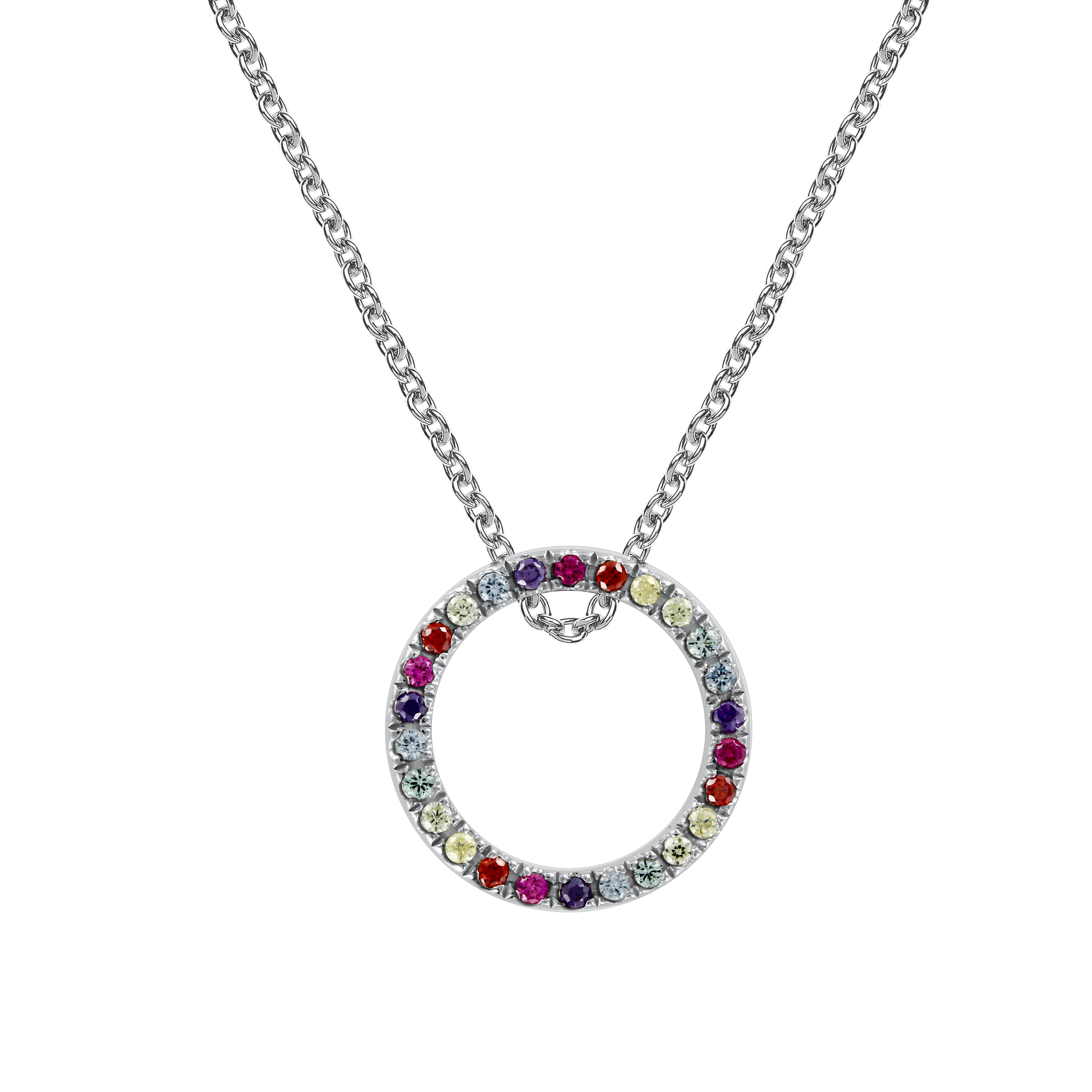 A delicate necklace featuring a graceful circle pendant adorned with sparkling zirconia in vibrant rainbow shades.