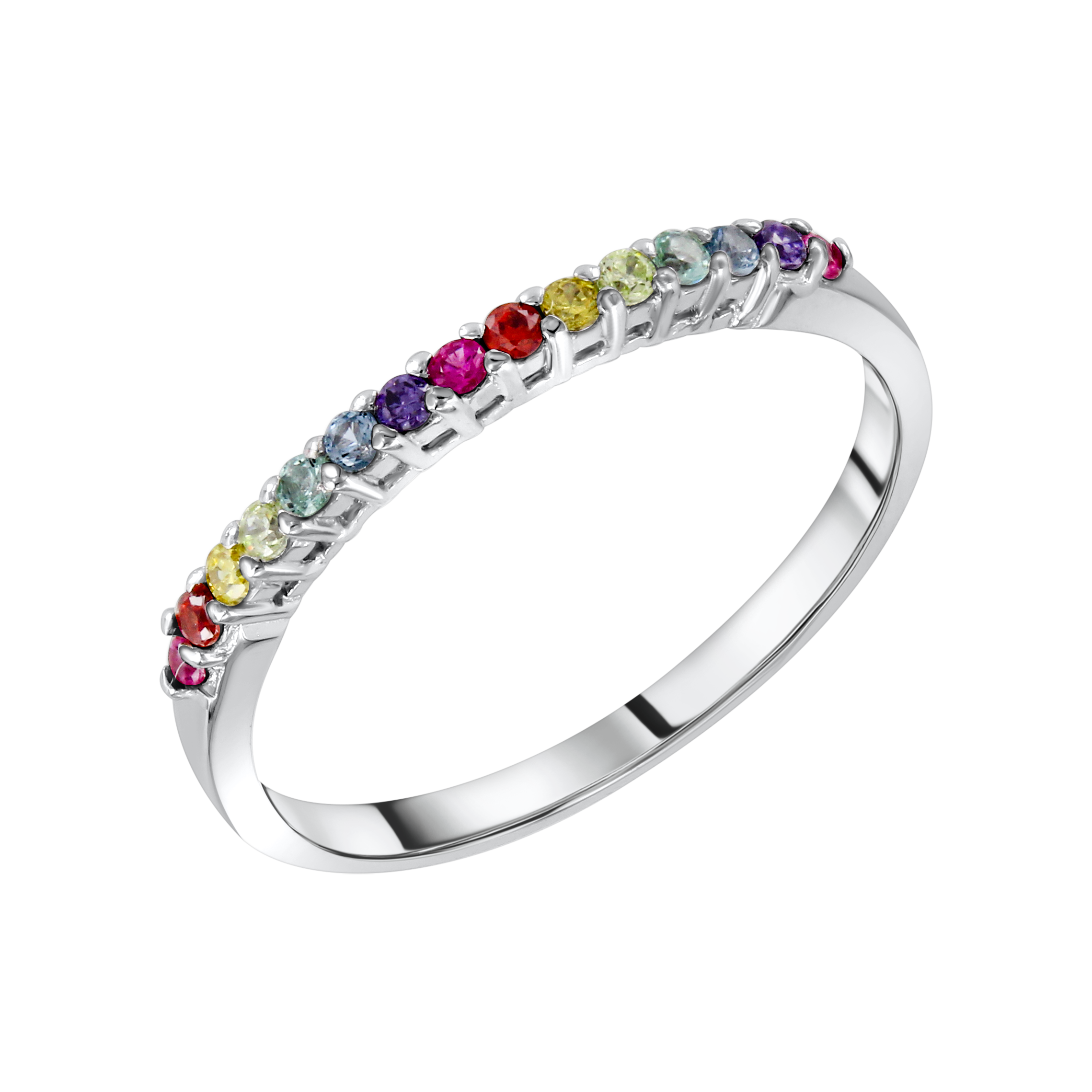 Delicate and modern, this ring features a graceful row of sparkling zirconia in fresh rainbow shades.